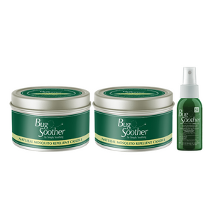 Try our repelling Bug Soother candle paired with two 8 oz. candles and 1 oz. Bug Soother Spray Pack! Our Bug Soother Mosquito Repellent Candle features lemongrass oil with a touch of vanilla for the well-loved scent of Bug Soother in candle form. Perfect along with our traditional spray to keep those biting bugs away so your family can enjoy a night on the patio or ball game without annoying bugs.